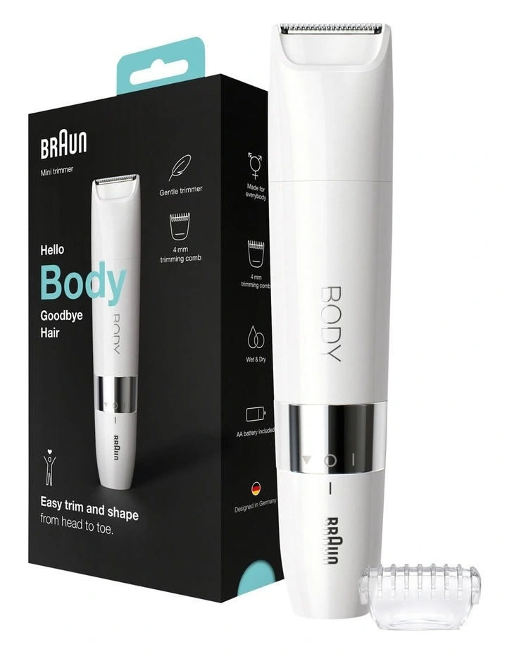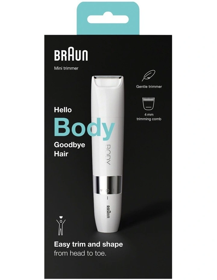 A purpose-built mini-sized electric body hair trimmer for everybody, delivering fast, easy and gentle resultseven in sensitive areas. The Braun Mini Trimmer cuts with precision, giving you close control over the length of your hair. Quick and gentle body hair trimming: whenever, wherever.