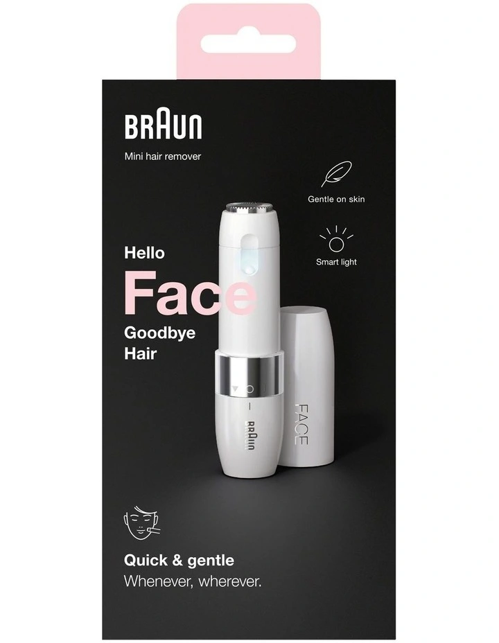 An elegantly designed, mini-sized electric facial hair remover for women, delivering fast and gentle hair removal results. The Braun Mini Hair Remover cuts hair close to skin level, leaving your face smooth, consistent and free of peach fuzz. Quick and gentle hair removal: whenever, wherever. Box includes: 1 X Mini Hair Remover 1 X White Cap 1 X Cleaning Brush 1 X AA Battery