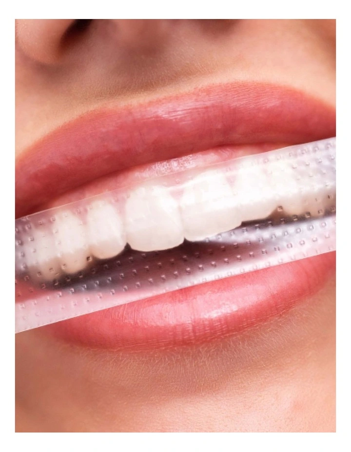 Care and Use Instructions: Dry teeth before use. Peel off long strip and apply sticky side to top teeth. Press strip down and fold over back of teeth to secure. Repeat for short strip on bottom teeth. Allow 30 minutes for whitening treatment. Remove and rinse mouth with water