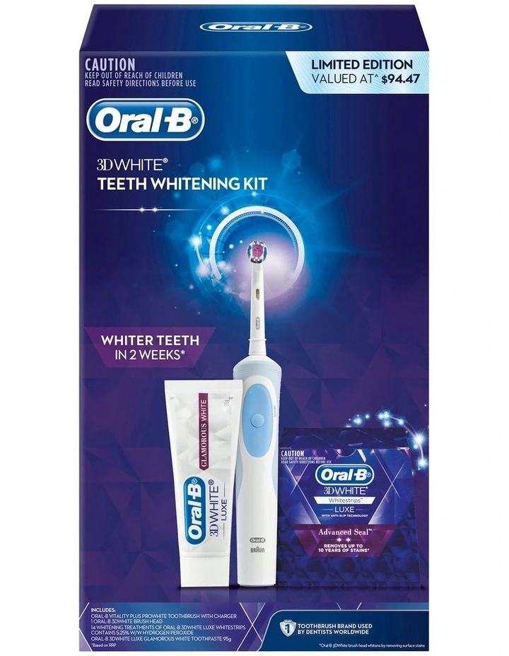 Contains: Oral-B Vitality ProWhite Electric Toothbrush with Charger, Oral-B 3DWhite Luxe Advance Seal Whitestrips, Oral-B 3DWhite Luxe Glamorous White Toothpaste 95g